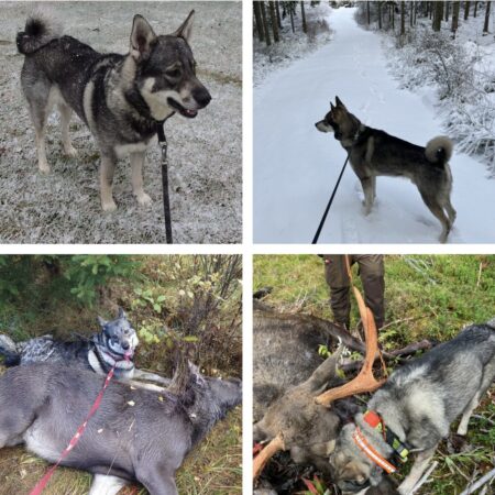 Ragge är från en kull där 9/11 är Jch just nu, även han en mkt vacker hane med den rätta jaktlusten, otroligt driv och motor i söket, söker stort, fungerar utmärkt norröver som söder, underbart jämthunds skall, skallar 70-100 skall/min, bra förmåga att ställa i upptaget, hög fart och motor att få stopp på flyende älg, utmärkt mentalitet. En riktig myshund i hemmet. Ragge blev trea på sydsvenska älghundsklubbens KM hösten 2025, ett very good och ett excellent med Ck på utställning, 62cm hög.